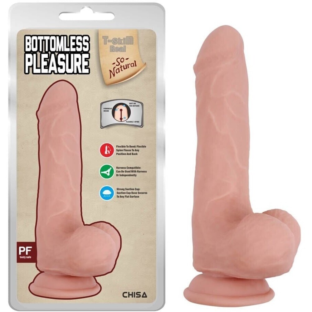 Dildo-ul Bottomless Pleasure-Flesh se distinge prin designul său atent conceput, având o formă ce imită un organ natural. Realizat din material TPE, acesta prezintă un strat exterior moale, similar texturii pielii, și un miez interior ferm, oferind o experiență plăcută și realistă. Cu o lungime de 20 cm și un diametru de 4,5 cm, acest produs este disponibil într-o nuanță de culoare flesh, fiind ideal pentru utilizatorii care caută un articol elegant și funcțional. Testiculele incluse și ventuza rezistentă la apă permit fixarea pe o suprafață plană, oferind flexibilitate în utilizare.
