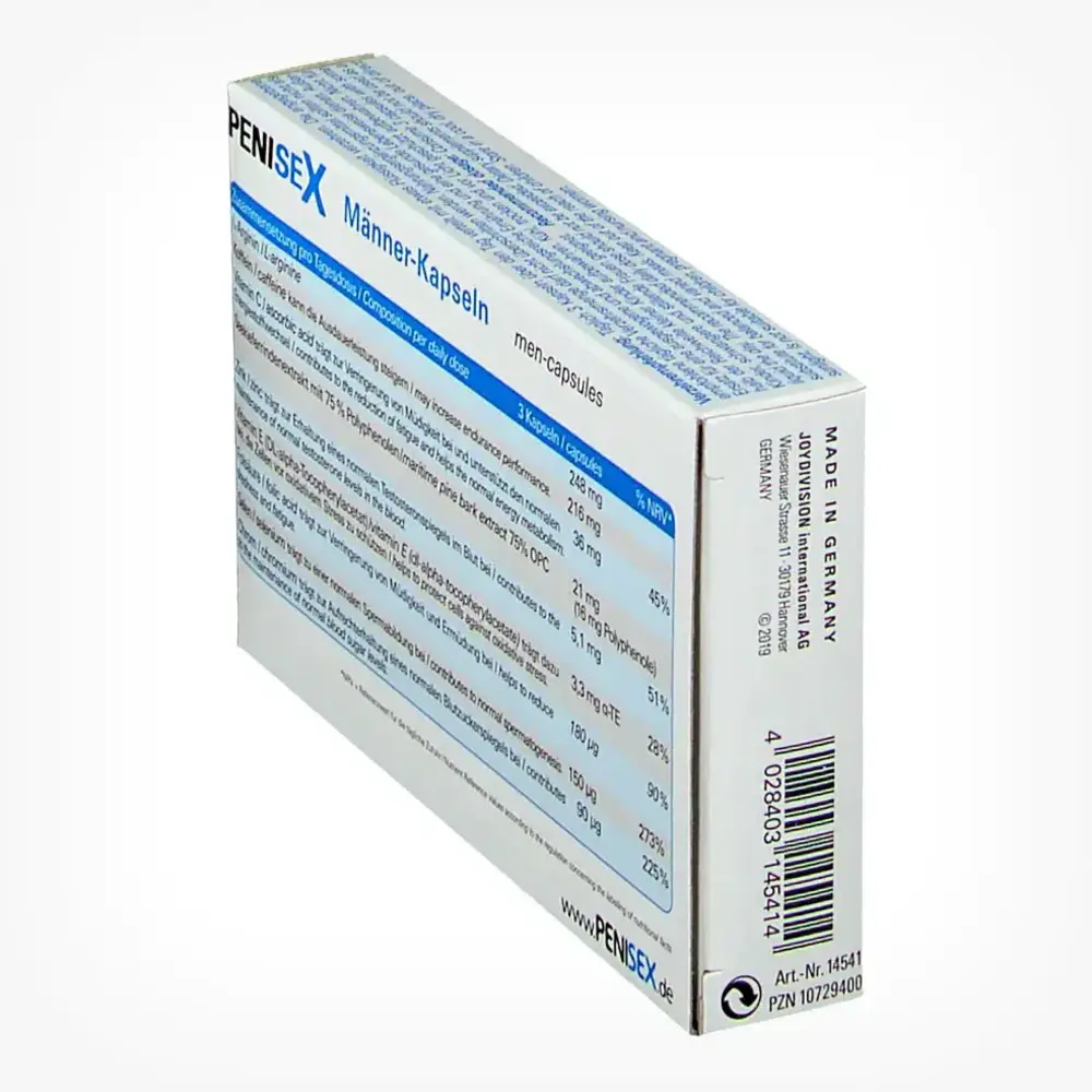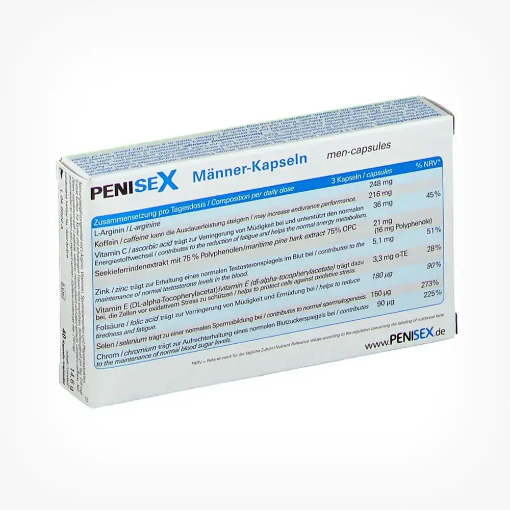 PENISEX – Kraft-Kapseln (Power-Capsules), 40 Kapseln reprezintă un supliment alimentar dezvoltat special pentru bărbați, având rolul de a oferi un suport nutrițional specific. Aceste capsule sunt formulate cu ingrediente precum cafeina, extracte din plante, vitamine și oligoelemente, care contribuie la o stare generală de bine și la menținerea energiei pe parcursul zilei. Conținutul de cafeină din PENISEX poate îmbunătăți rezistența fizică și performanța, în timp ce acidul folic ajută la reducerea oboselii și a stării de epuizare.
