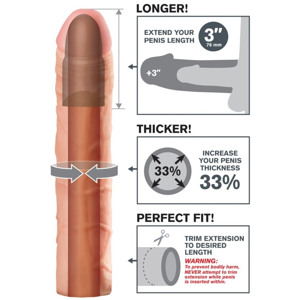 Cu o extensie de 1 inch la vârf, Perfect 3″ Extension Light permite o experiență de utilizare cu un plus de adâncire, în timp ce grosimea sa crescută cu 33% față de dimensiunile obișnuite adaugă un volum suplimentar. Acest prelungitor este ideal pentru cei care doresc să îmbunătățească performanțele pe termen lung, oferind o senzație completă și un plus de confort. Materialul super-moale Fanta Flesh® imită pielea naturală, ceea ce face ca produsul să fie extrem de confortabil, având o senzație plăcută la contactul cu pielea.