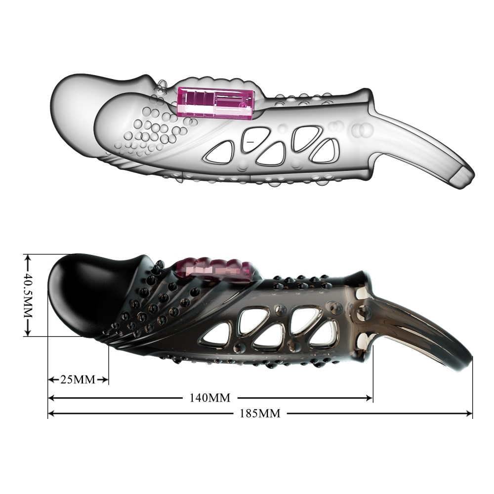 La capătul prelungitorului se află un vibrator integrat care se activează la contact, extinzând în mod semnificativ lungimea și stimulând în același timp. Vibrațiile, distribuite uniform, adaugă un plus de intensitate, oferind o experiență mai durabilă și plăcută. Alimentarea este asigurată de 3 baterii LR41, ce garantează o durată de utilizare optimă, iar designul este adaptat pentru a asigura o performanță constantă.