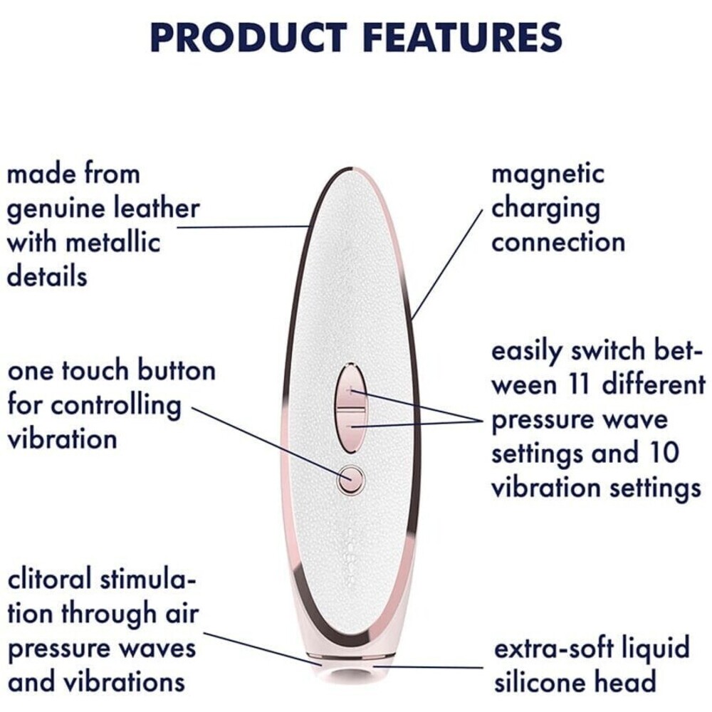 Echipat cu două motoare controlabile separat, Satisfyer Luxury Prêt-à-porter permite utilizatorului să aleagă dintr-o gamă variată de 11 intensități diferite de unde de presiune și 10 programe de vibrație. Această diversitate asigură personalizarea experienței, facilitând găsirea combinației ideale pentru fiecare utilizator. Controlul intuitiv al funcțiilor facilitează ajustarea setărilor în funcție de preferințe, oferind un grad înalt de confort și satisfacție.