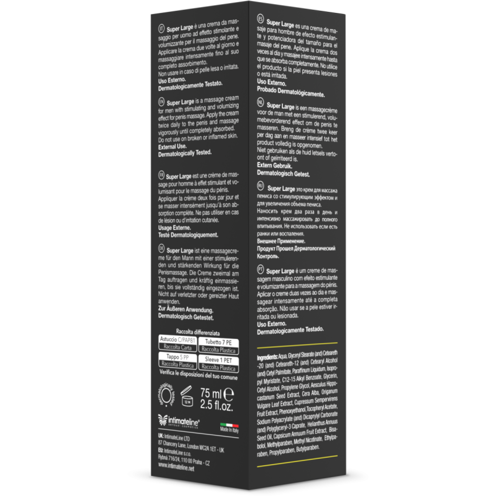 Super Large, 75 ml este un produs complet natural care intensifică efectele masajului datorită ingredientelor dermo-tensile active. Acestea contribuie la remodelarea eficientă și la atingerea dimensiunii ideale. Conceput pentru bărbați, acest gel italian este un aliat de încredere pentru cei care doresc să îmbunătățească performanțele și să obțină o erecție mai puternică.
